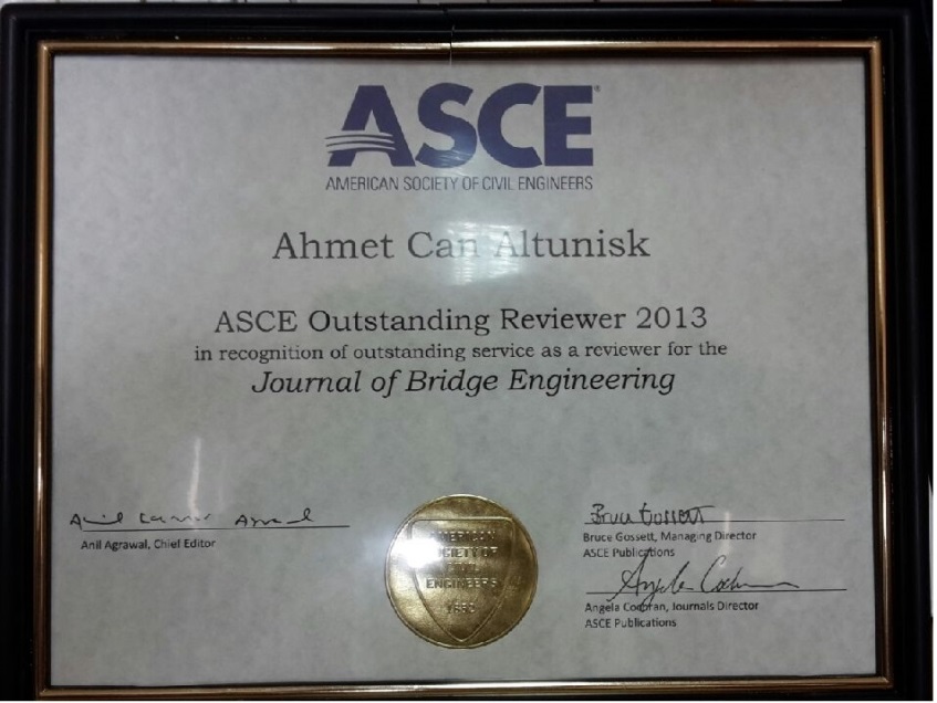 Mühendislik Fakültesi, İnşaat Mühendisliği Bölümü Öğretim üyelerinden Doç. Dr. Ahmet Can ALTUNIŞIK, ASCE American Society of Civil Engineers tarafından her yıl düzenli olarak verilen ve editör yorumları, yazar görüşleri, hakemlik sayısı, çalışma süresi, geri dönüş parametreleri gibi birçok konu dikkate alınarak belirlenen Outstanding Reviewers-2013 ödülünü almaya hak kazanmıştır.
