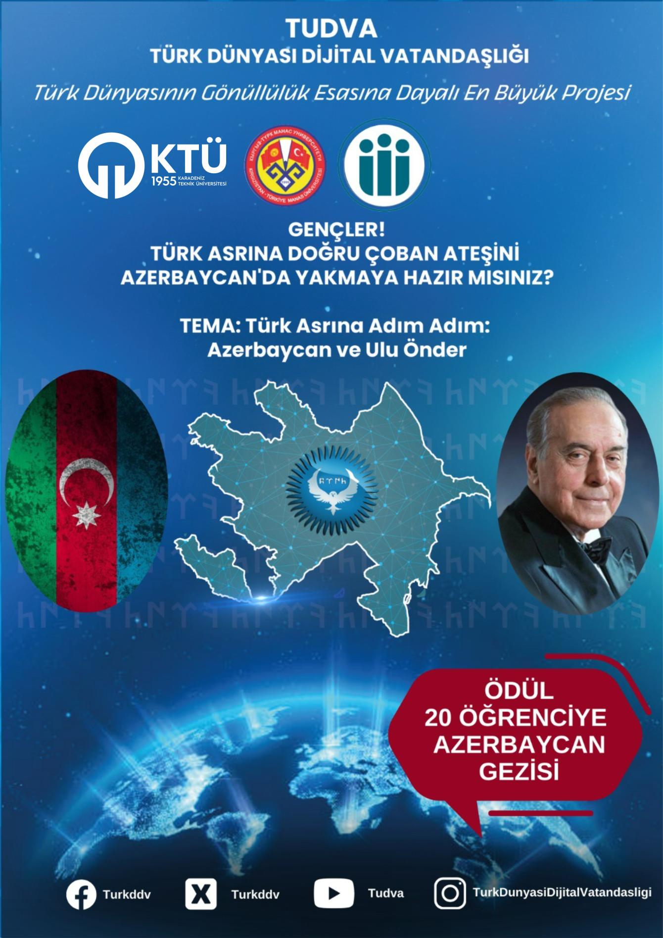 2023-2024 öğretim yılında ana teması “Türk Asrına Adım Adım: Azerbaycan ve 21. Yüzyıl Türk Asrı: Azerbaycan ve Ulu Önder Haydar Aliyev” olarak belirlenmiştir. Üniversitemiz öğrencileri proje kapsamında yürütülen eğitimlere katılmak için aşağıdaki başvuru linki aracılığıyla kayıt yaptırabilirler.
