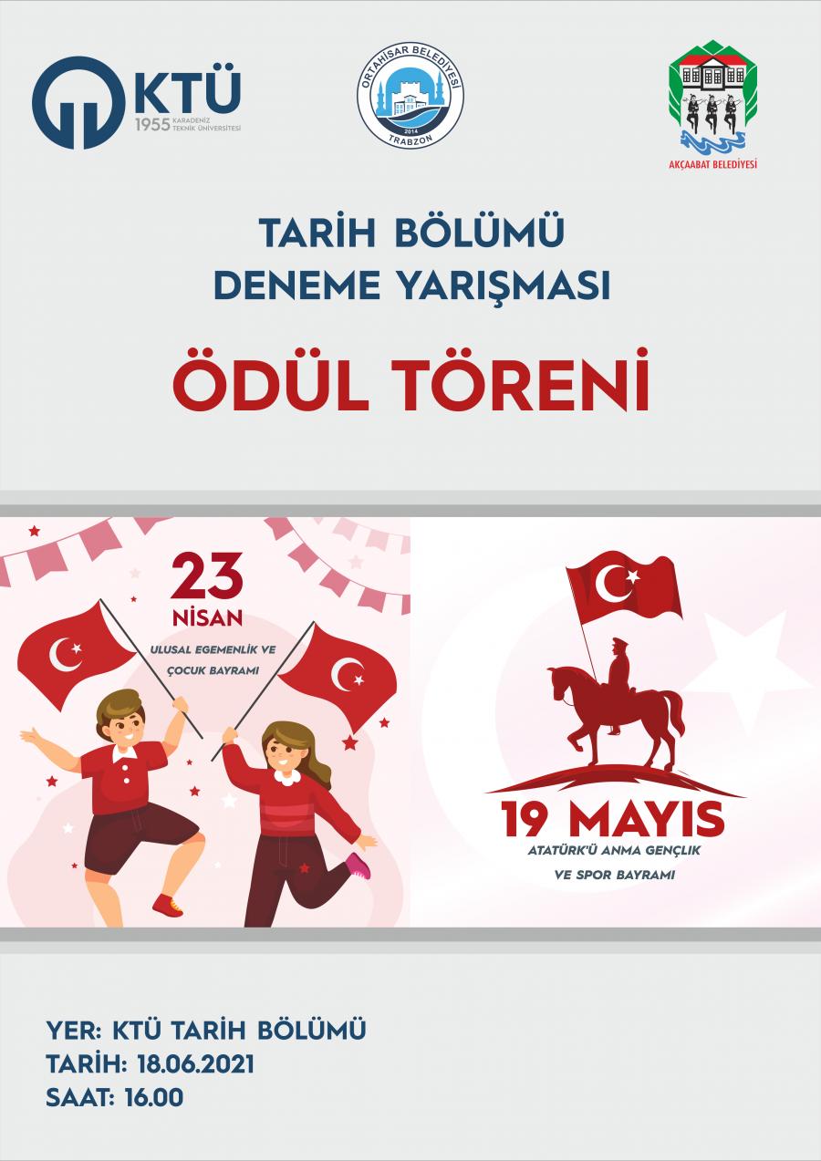 KTÜ Edebiyat Fakültesi Tarih Bölümü'nün Ortahisar ve Akçaabat Belediyeslerinin destekleriyle düzenlediği “23 Nisan Ulusal egemenlik ve Çocuk Bayramı” ile “19 Mayıs Gençlik ve Spor Bayramı’nın Değeri Nedir?” başlıklı deneme yarışmalarının ödül töreni 18.06.2021 tarihinde, saat 16.00'da Edebiyat Fakültesi Prof. Dr. Hikmet Öksüz Konferans Salonu'nda gerçekleştirilecektir.