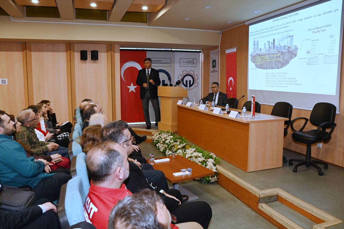 Panelin ilk sunumu, KTÜ Jeoloji Mühendisliği Bölümü Öğretim Üyesi Prof. Dr. Osman BEKTAŞ tarafından gerçekleştirildi. BEKTAŞ, Doğu Karadeniz Bölgesi’nin deprem tehlikesini ve diri faylarını değerlendirerek, bölgenin jeolojik yapısına ve yerel zemin özelliklerinin deprem hasarı üzerindeki etkisine dikkat çekti. Sunumunda, risk analizlerinin bilimsel veriler doğrultusunda güncellenmesi gerektiğini vurguladı.