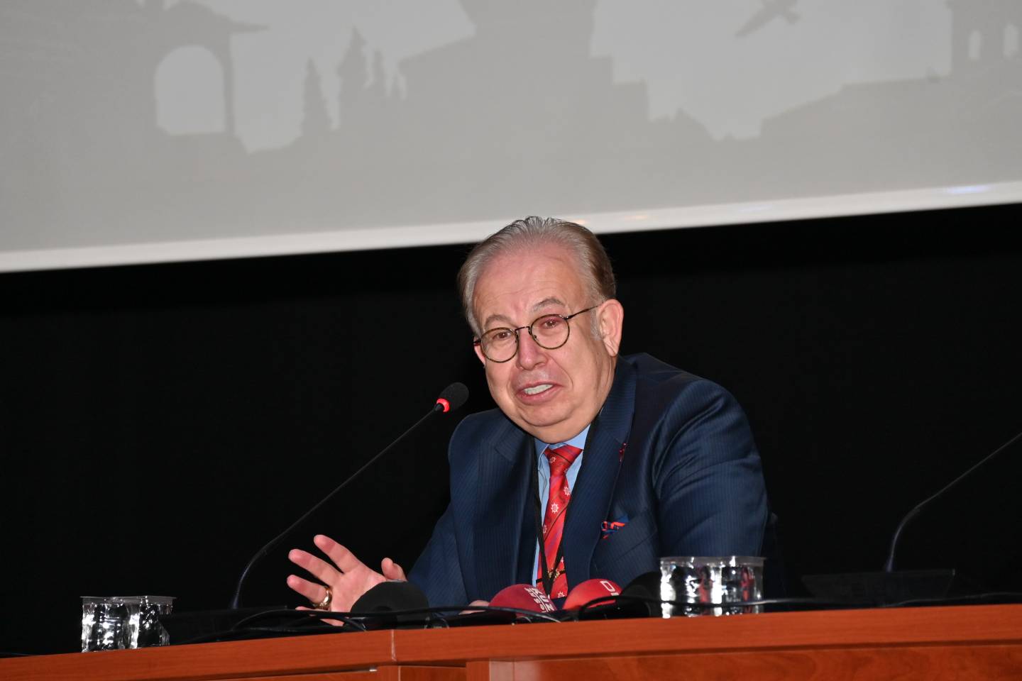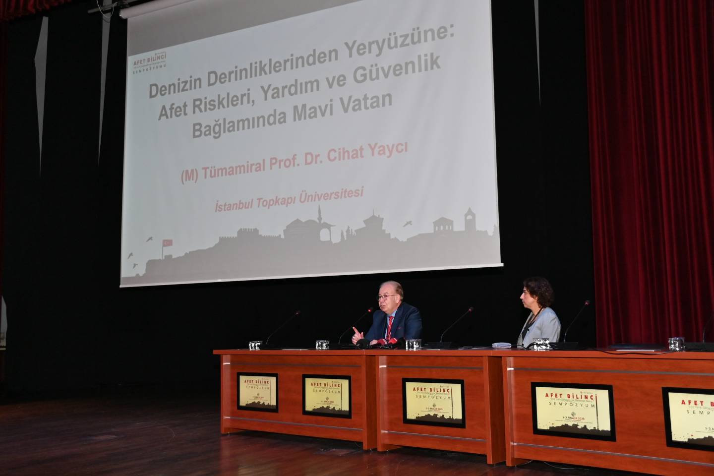 Açılış konuşmalarının ardından davetli konuşmacı Emekli Tümamiral Prof. Dr. Cihat YAYCI, “Denizin Derinliklerinden Yeryüzüne: Mavi Vatan” başlıklı sunumunda afet riskleri, bölgesel güvenlik ve müdahale stratejilerini jeopolitik bir perspektifle değerlendirdi. Prof. Dr. Cihat YAYCI, afet yönetiminin yalnızca teknik bir süreç değil, aynı zamanda ulusal güvenlik açısından stratejik boyutlar taşıyan çok yönlü bir konu olduğunu belirtti.
