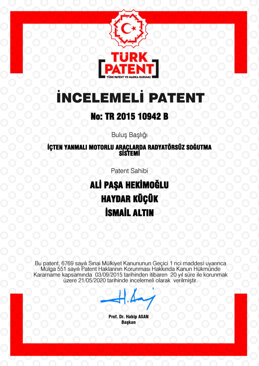 Üniversitemiz Sürmene Deniz Bilimleri Fakültesi Gemi İnşaatı ve Gemi Makineleri bölümünden Doktor Öğretim Üyesi İsmail ALTIN ile Recep Tayyip Erdoğan Üniversitesi Mühendislik Fakültesi Makine Mühendisliği Bölümü öğretim üyelerinden Prof. Dr. Haydar KÜÇÜK ve Doktor Öğretim Üyesi Ali Paşa HEKİMOĞLU’nun birlikte yaptıkları “İçten Yanmalı Motorlu Araçlarda Radyatörsüz Soğutma Sistemi” başlıklı buluş Türk Patent ve Marka Kurumundan incelemeli patent aldı.