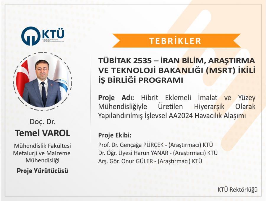 Üniversitemiz Mühendislik Fakültesi Metalurji ve Malzeme Mühendisliği Bölümü öğretim üyesi Doç. Dr. Temel VAROL’un "Hibrit Eklemeli İmalat ve Yüzey Mühendisliğiyle Üretilen Hiyerarşik Olarak Yapılandırılmış İşlevsel AA2024 Havacılık Alaşımı" başlıklı projesi “TÜBİTAK 2535-İran Bilim, Araştırma ve Teknoloji Bakanlığı (MSRT) İkili İş Birliği Programı” kapsamında desteklenmiştir.