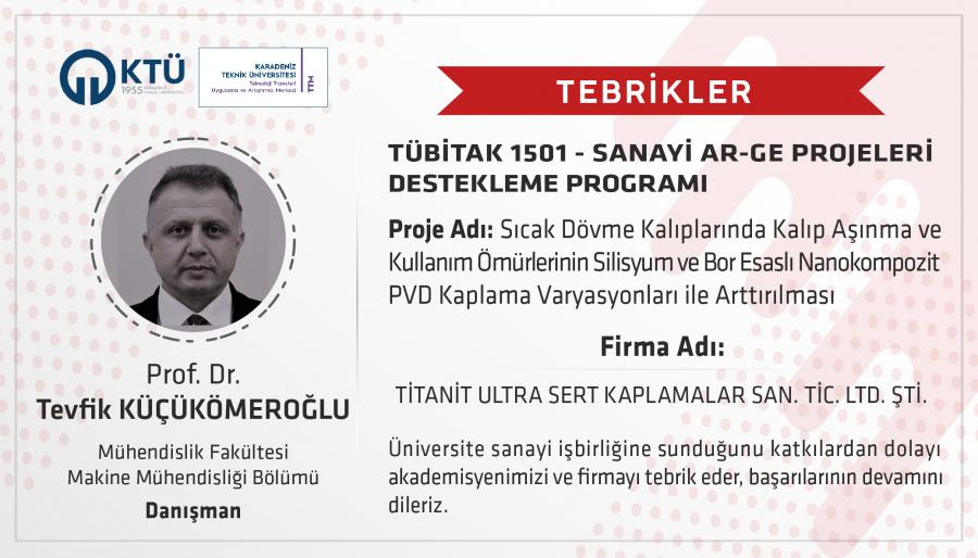 Titanit Ultra Sert Kaplamalar San. Tic. Ltd. Şti. firmasının yürütücüsü olduğu ve Üniversitemiz araştırmacılarından Prof. Dr. Tevfik KÜÇÜKÖMEROĞLU’nun danışman olarak yer aldığı TÜBİTAK 1501 Sanayi Ar-Ge Projeleri Destekleme Programı Çağrısı kapsamında sunulan "Sıcak Dövme Kalıplarında Kalıp Aşınma ve Kullanım Ömürlerinin Silisyum ve Bor Esaslı Nanokompozit PVD Kaplama Varyasyonları ile Arttırılması" başlıklı projesi desteklenmeye hak kazanmıştır.