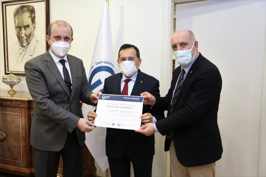 2018 yılında yeniden seçildiği TTSO Başkanlığı görevini halen yürüten ve nano akışkanlarda ısı transferi konusunda çalışmalar sürdüren Mustafa Suat HACISALİHOĞLU’na Doktora Diploması, Tez Danışmanı Prof. Dr. Burhan ÇUHADAROĞLU, Rektör Yardımcıları Prof. Dr. Akif CİNEL ve Prof. Dr. Cemil RAKICI’nın katılımıyla Rektörümüz Prof. Dr. Hamdullah ÇUVALCI tarafından, makamında düzenlenen törenle takdim edildi.