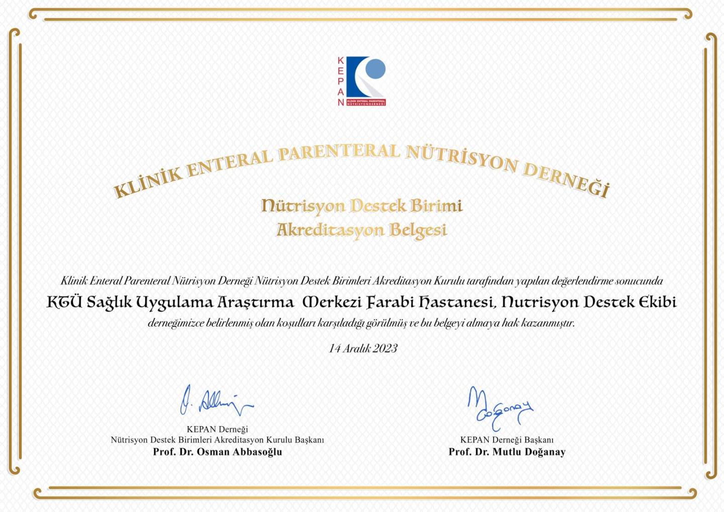 Klinik Enteral Parenteral Nütrisyon Derneği (KEPAN) tarafından ülkemiz genelindeki tüm Nütrisyon Destek Birimlerini belirli bir düzeye taşımak, hizmet ve eğitim kalitesini yükseltmek amacıyla “Nütrisyon Destek Birimleri Akreditasyon Programı Projesi” başlatılmıştır. Bu proje kapsamında; Hacettepe Üniversitesi Tıp Fakültesi, Sağlık Bilimleri Üniversitesi-Ankara Bilkent Şehir Hastanesi ve Ankara Üniversitesi Tıp Fakültesi’nden sonra Karadeniz Teknik Üniversitesi Sağlık Uygulama ve Araştırma Merkezi Farabi Hastanesi Nütrisyon Destek Ekibi, Türkiye’de 4. kurum olarak 14 Aralık 2023 tarihinde “Akreditasyon Belgesi” almaya hak kazandı.