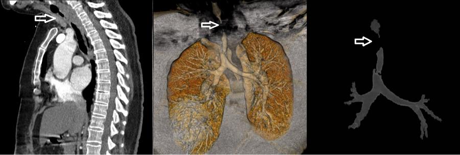 COVID-19 enfeksiyonu nedeniyle yoğun bakımda mekanik ventilatör ile tedavi görüp taburcu olan 52 yaşındaki kadın hasta, bir ay sonra nefes darlığı şikâyeti ile KTÜ Farabi Hastanesi Göğüs Cerrahisi Polikliniği’ne başvurdu. Yapılan detaylı tetkikler sonucunda hastanın soluk borusunda 4,5 cm uzunluğunda bir daralma tespit edildi. Solunum sisteminin en önemli unsurlarından birisi olan soluk borusunun hava yolunun açılması için acilen Rijit Bronkoskopi yöntemi uygulanarak hastanın soluk borusundaki darlık genişletildi. Hastanın solunumu geçici olarak rahatlatılarak sorunlu bölgenin detaylı olarak teşhis edilmesi sağlandı. Yapılan değerlendirmeler sonucunda, daralan soluk borusu kısmı için iki hafta sonrasına ameliyat planlandı.