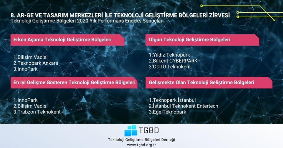 Ar-Ge ve Tasarım Merkezleri ile Teknoloji Bölgeleri Zirvesi, Türkiye’nin bilişim ve inovasyon üssü Bilişim Vadisi’nde gerçekleştirildi. Zirvede, Ar-Ge ve Tasarım Merkezleri için 10 kategoride 30, Teknoparklar için de 4 kategoride 12 olmak üzere toplamda 42 ödül sahiplerini buldu.