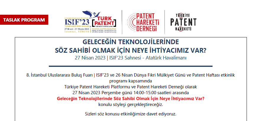 ISIF Paten Fuarında Türkiye Patent Hareketi Platformu tarafından organize edilen "Geleceğin Teknolojilerinde Söz Sahibi Olmak İçin Neye İhtiyacımız Var?" başlıklı bir söyleşide TTM Müdürümüz Prof.Dr. OKTAY YILDIZ konuşmacı olarak alacaktır.