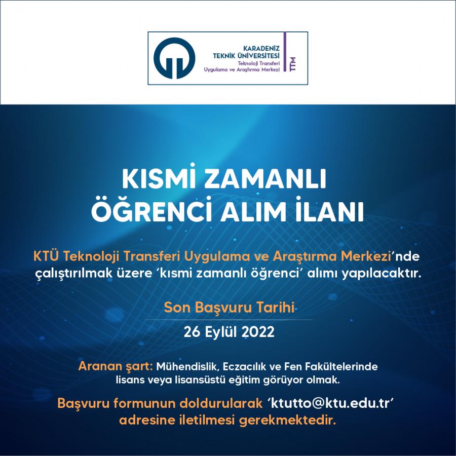 KTÜ Teknoloji Transferi Uygulama ve Araştırma Merkezi'nde Çalıştırılmak Üzere Kısmi Zamanlı Öğrenci Alım İlanı