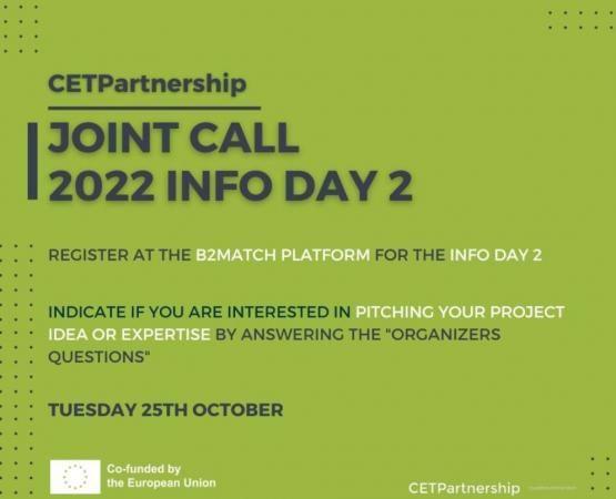 Birincisi 13 Eylül 2022 tarihinde gerçekleştirilen CETPartnership Bilgi Günü etkinliğinin ikincisi 25 Ekim 2022 tarihinde çevrimiçi olarak gerçekleştirilecektir. Etkinlik kapsamında söz konusu Ortaklık hakkında genel ve tematik bilgilendirmede bulunulacak olup B2Match platformu üzerinden kayıt yaptırılması zorunludur.