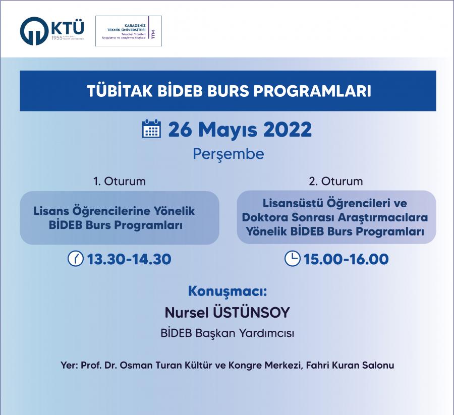 1. Oturum: “Lisans Öğrencilerine Yönelik BİDEB Burs Programları” 26 Mayıs 2022 Perşembe saat 13.30-14.30 saatleri arasında, Prof. Dr. Osman Turan Kültür ve Kongre Merkezi, Fahri Kuran Salonu'nda yüz yüze gerçekleştirilecektir.