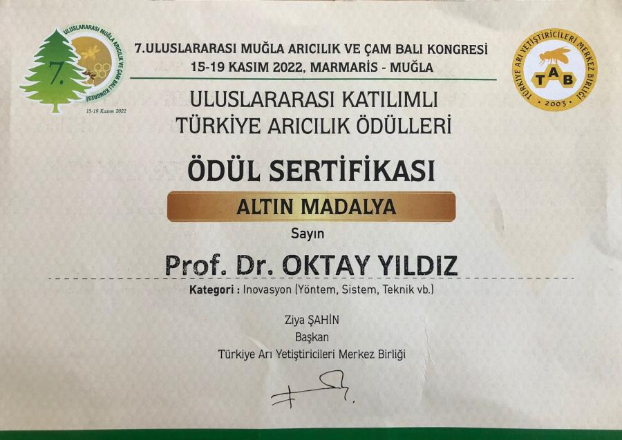 Üniversitemiz Eczacılık Fakültesi öğretim üyelerinden Prof. Dr. Oktay YILDIZ 7. Uluslararası Muğla Arıcılık ve Çam Balı Kongresi’nde ‘İnovasyon’ kategorisinde, Üniversitemiz Teknoloji Transferi Uygulama ve Araştırma Merkezi ile hem ulusal hem de uluslararası patent başvurusu yapılmış olan Arı İpeğinin Ayrıştırılması, Kozmetik ve İlaç Amaçlı Kullanım Formlarına Dönüştürülmesi' isimli projesiyle Altın Madalya Ödülü’ne layık görülmüştür.