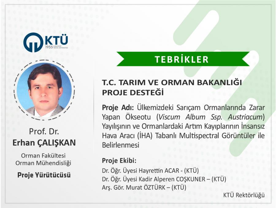 Üniversitemiz Orman Fakültesi Orman Mühendisliği Bölümü Öğretim Üyesi Prof. Dr. Erhan ÇALIŞKAN’ın "Ülkemizdeki Sarıçam Ormanlarında Zarar Yapan Ökseotu (Viscum Album Ssp. Austriacum) Yayılışının ve Ormanlardaki Artım Kayıplarının İnsansız Hava Aracı (İHA) Tabanlı Multispectral Görüntüler ile Belirlenmesi" başlıklı projesi “T.C. Tarım ve Orman Bakanlığı” kapsamında desteklenmiştir.