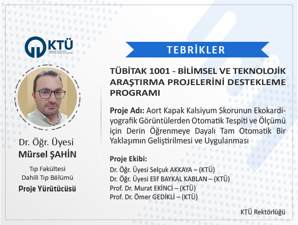 Üniversitemiz Tıp Fakültesi Dahili Tıp Bölümü Öğretim Üyesi Dr. Öğr. Üyesi Mürsel ŞAHİN’in "Aort Kapak Kalsiyum Skorunun Ekokardiyografik Görüntülerden Otomatik Tespiti ve Ölçümü için Derin Öğrenmeye Dayalı Tam Otomatik Bir Yaklaşımın Geliştirilmesi ve Uygulanması" başlıklı projesi TÜBİTAK 1001 Programı kapsamında desteklenmiştir.