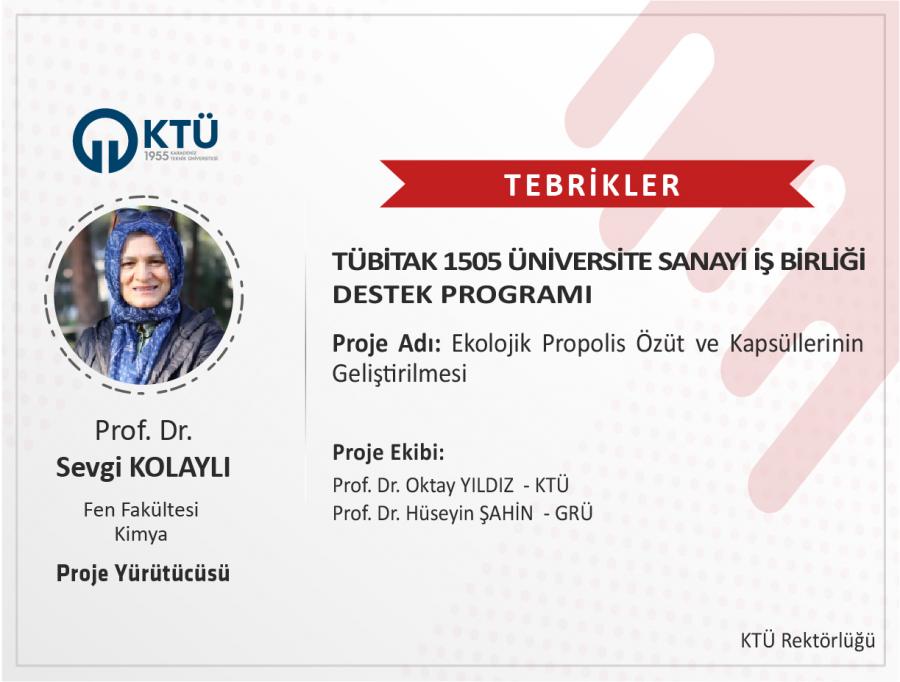 Üniversitemiz Fen Fakültesi Kimya Bölümü Öğretim Üyesi Prof. Dr. Sevgi KOLAYLI'nın "Ekolojik Propolis Özüt ve Kapsüllerinin Geliştirilmesi" başlıklı projesi TÜBİTAK 1505–''Üniversite-Sanayi İş Birliği Programı'' kapsamında desteklenmiştir.