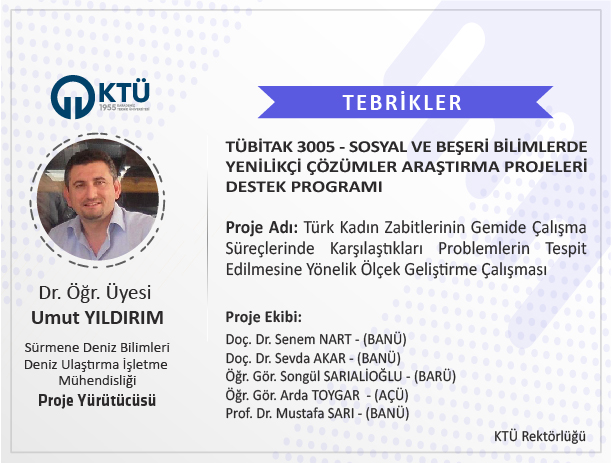 Üniversitemiz Sürmene Deniz Bilimleri Fakültesi Deniz Ulaştırma İşletme Mühendisliği Bölümü Öğretim Üyesi Dr. Öğr. Üyesi Umut YILDIRIM’ın "Türk Kadın Zabitlerinin Gemide Çalışma Süreçlerinde Karşılaştıkları Problemlerin Tespit Edilmesine Yönelik Ölçek Geliştirme Çalışması" başlıklı projesi TÜBİTAK 3005 “Sosyal ve Beşeri Bilimlerde Yenilikçi Çözümler Araştırma Projeleri Destek Programı” kapsamında desteklenmiştir.