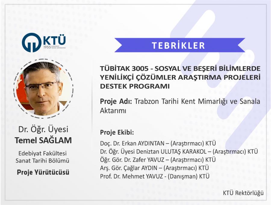 Üniversitemiz Edebiyat Fakültesi Sanat Tarihi Bölümü öğretim üyesi Dr. Öğr. Üyesi Temel SAĞLAM’ın "Trabzon Tarihi Kent Mimarlığı ve Sanala Aktarımı" başlıklı projesi “TÜBİTAK 3005-Sosyal ve Beşeri Bilimlerde Yenilikçi Çözümler Araştırma Projeleri Destek Programı” kapsamında desteklenmiştir.