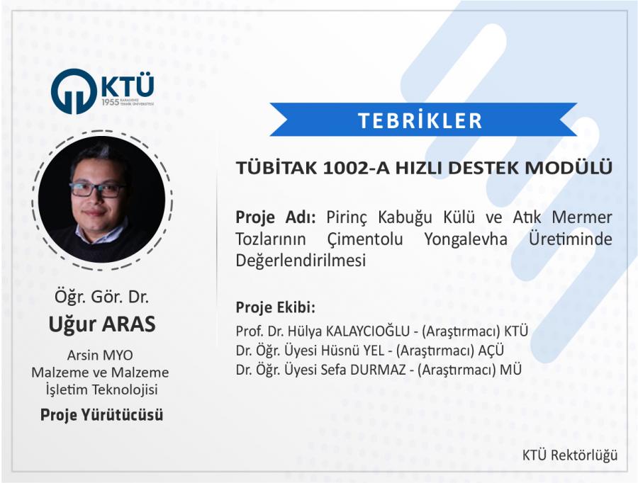 Üniversitemiz Arsin Meslek Yüksekokulu Malzeme ve Malzeme İşletim Teknolojisi Bölümü öğretim üyesi Öğr. Gör. Dr. Uğur ARAS’ın "Pirinç Kabuğu Külü ve Atık Mermer Tozlarının Çimentolu Yongalevha Üretiminde Değerlendirilmesi" başlıklı projesi “TÜBİTAK 1002-A Hızlı Destek Modülü” kapsamında desteklenmiştir.