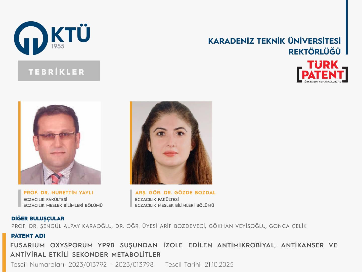 İki ayrı Patent başvurusu tescillenen akademisyenlerimizi tebrik eder, sağladıkları katkılardan ötürü akademisyenlerimize teşekkür ederiz.