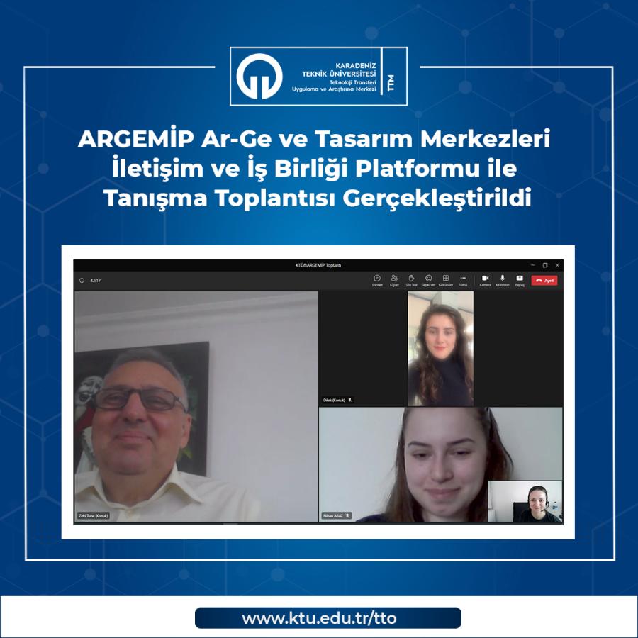 Türkiye’de Ar-Ge ve Tasarım merkezleri arasında iş birliğinin arttırılması, Ar-Ge ve Tasarım faaliyetlerinin ivmelenmesi ve gelişmesi için sahada aktif faaliyetler yürüten ARGEMİP Ar-Ge ve Tasarım Merkezleri İletişim ve İş Birliği Platformu ile çevrim içi tanışma toplantısı gerçekleştirildi. ARGEMİP’i temsilen Genel Sekreter Zeki TUNA, Yürütme Kurulu Asistanı Nihan Nigar ARAT, KTÜ TTM’yi temsilen Üniversite Sanayi İş Birliği Modül Koordinatörü Öğr. Gör. Beril DEĞERMENCİ ve Proje Uzmanı Dilek İSKENDER BALABAN tarafından gerçekleştirilen toplantıda Ar-Ge ve Tasarım Merkezlerine yönelik gerçekleştirilecek iş birlikleri hakkında görüşme sağlandı.