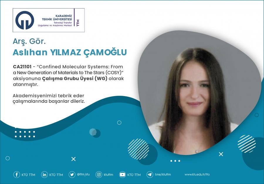 Üniversitemiz Fen Fakültesi Kimya Bölümü öğretim üyesi Arş. Gör. Aslıhan YILMAZ ÇAMOĞLU, COST Programı’nın “CA21101 - Confined Molecular Systems: From a New Generation of Materials to The Stars (COSY)” aksiyonuna Çalışma Grubu Üyesi (WG) olarak atanmıştır.