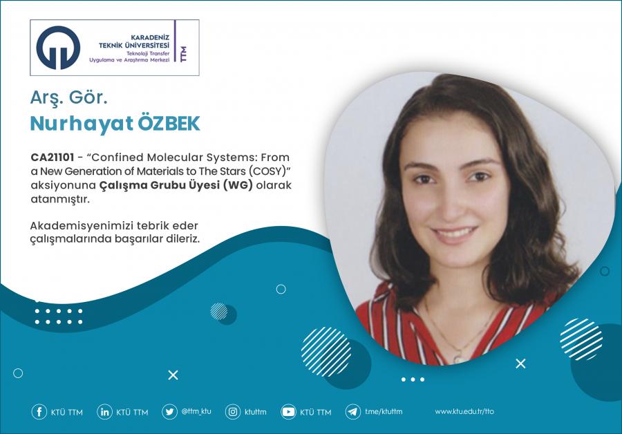 Üniversitemiz Fen Fakültesi Kimya Bölümü öğretim üyesi Arş. Gör. Nurhayat ÖZBEK, COST Programı’nın “CA21101 - Confined Molecular Systems: From a New Generation of Materials to The Stars (COSY)” aksiyonuna Çalışma Grubu Üyesi (WG) olarak atanmıştır.