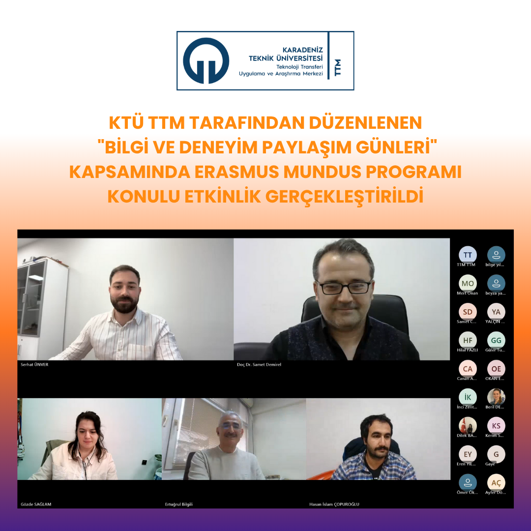 Karadeniz Teknik Üniversitesi Teknoloji Transferi Uygulama ve Araştırma Merkezi tarafından düzenlenen Bilgi ve Deneyim Paylaşım Günleri etkinlik serisi, “Erasmus Mundus Programı Bilgi ve Deneyim Paylaşımı” başlıklı oturumuyla devam etti.