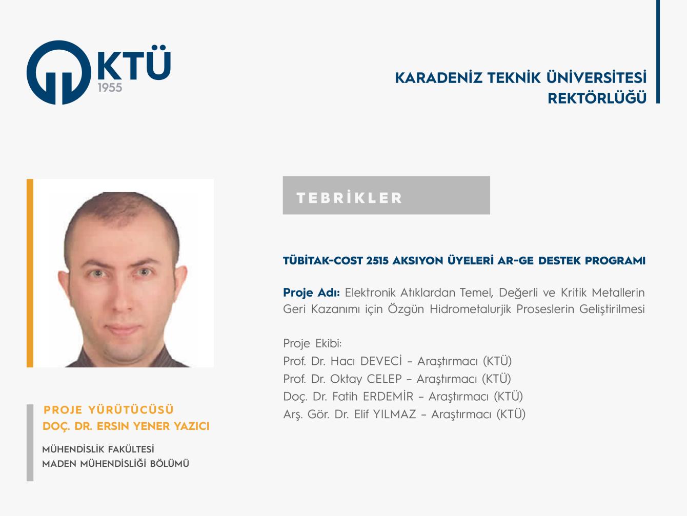 Üniversitemiz Mühendislik Fakültesi Maden Mühendisliği Bölümü Öğretim Üyesi Doç. Dr. Ersin Yener YAZICI’nın “Elektronik Atıklardan Temel, Değerli ve Kritik Metallerin Geri Kazanımı için Özgün Hidrometalurjik Proseslerin Geliştirilmesi” başlıklı projesi, TÜBİTAK-COST 2515 Aksiyon Üyeleri Ar-Ge Destek Programı kapsamında desteklenmiştir.
