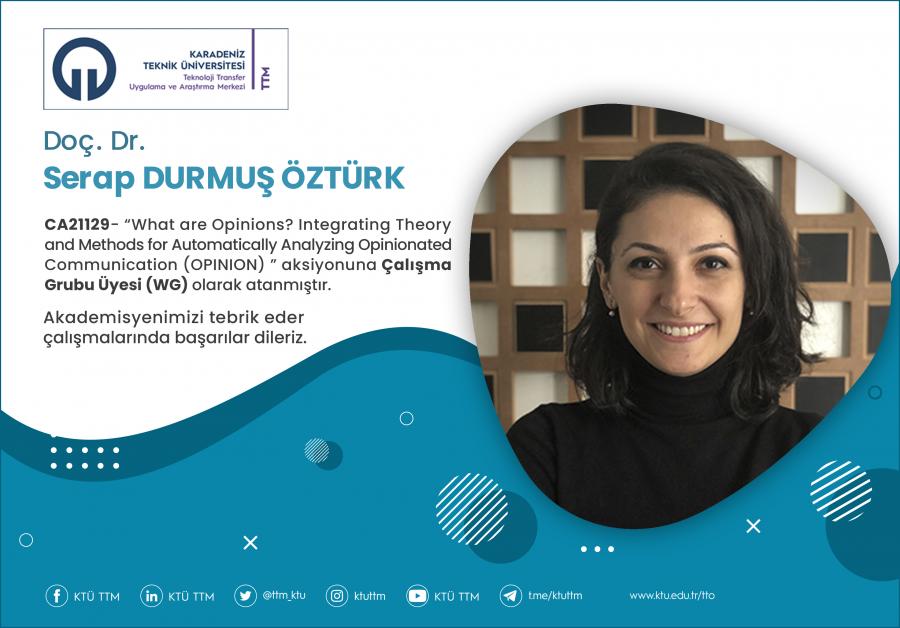 Üniversitemiz Mimarlık Fakültesi Mimarlık Bölümü öğretim üyesi Doç. Dr. Serap DURMUŞ ÖZTÜRK, COST Programı’nın “CA21129 - What are Opinions? Integrating Theory and Methods for Automatically Analyzing Opinionated Communication (OPINION) aksiyona Çalışma Grubu Üyesi (WG) olarak atanmıştır.