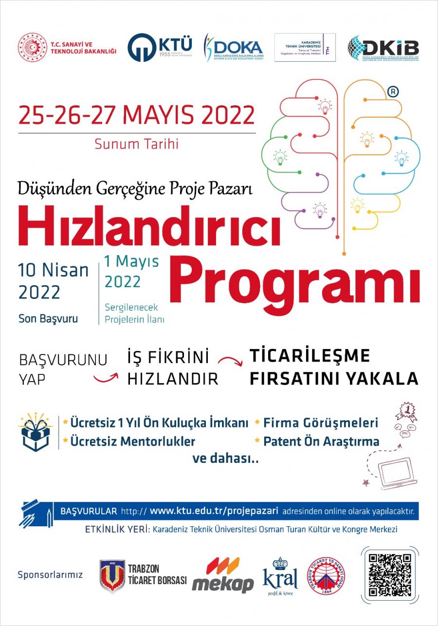 Doğu Karadeniz Kalkınma Ajansı ve bölge üniversiteleri iş birliği ile KTÜ TTM Düşünden Gerçeğine Proje Pazarı ile eş zamanlı başlayacak olan hızlandırıcı programına katılarak mentorlukler, eğitimler, başarılı girişimciler ve firmalarla görüşmeler sizleri bekliyor. Başvuru yapan adaylar ön eleme sonrası KTÜ Prof. Dr. Osman Turan Kültür ve Kongre Merkezi’nde jüri karşısında sunum yaparak hızlandırıcı programına katılabilecektir.