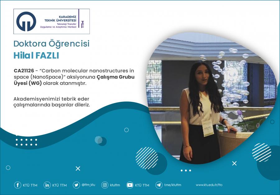 Üniversitemiz Fen Fakültesi Kimya Bölümü Doktora Öğrencisi Hilal FAZLI, COST Programı’nın “CA21126 - Carbon molecular nanostructures in space (NanoSpace)” aksiyonuna Çalışma Grubu Üyesi (WG) olarak atanmıştır.