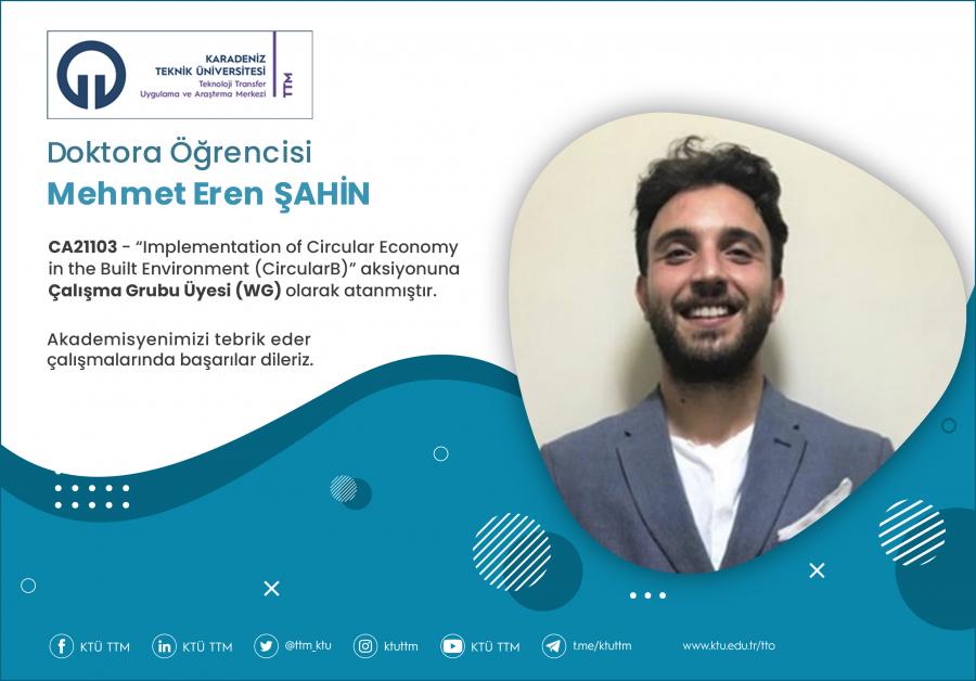 Üniversitemiz Orman Fakültesi Orman Endüstri Mühendisliği Bölümü Doktora Öğrencisi Mehmet Eren ŞAHİN, COST Programı’nın “CA21103 - Implementation of Circular Economy in the Built Environment (CircularB)” aksiyonuna Çalışma Grubu Üyesi (WG) olarak atanmıştır.