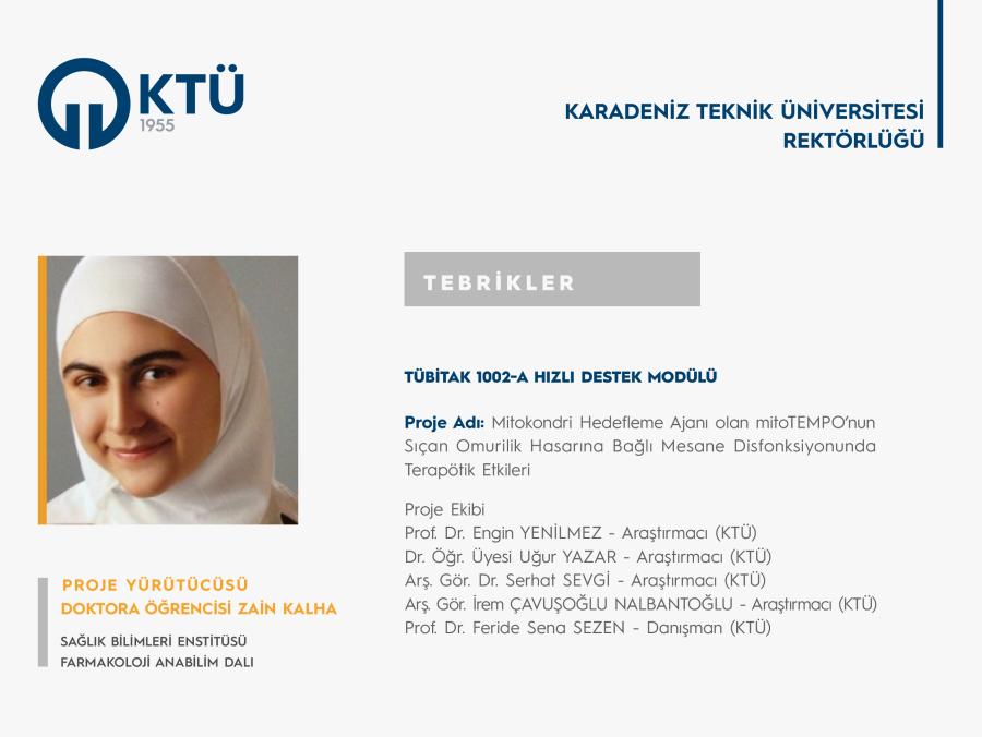 Üniversitemiz Sağlık Bilimleri Enstitüsü Farmakoloji Anabilim Dalı Doktora Öğrencisi Zain KALHA’nın "Mitokondri Hedefleme Ajanı olan mitoTEMPO’nun Sıçan Omurilik Hasarına Bağlı Mesane Disfonksiyonunda Terapötik Etkileri" başlıklı projesi “TÜBİTAK 1002-A Hızlı Destek Modülü” kapsamında desteklenmiştir.