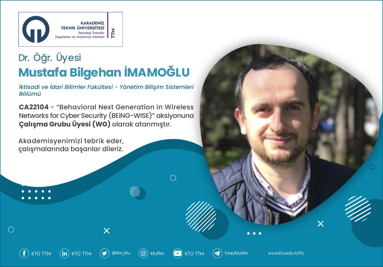 Üniversitemiz İktisadi ve İdari Bilimler Fakültesi Yönetim Bilişim Sistemleri Bölümü öğretim üyesi Dr. Öğr. Üyesi Mustafa Bilgehan İMAMOĞLU, COST Programı’nın “CA22104 - Behavioral Next Generation in Wireless Networks for Cyber Security (BEiNG-WISE)” aksiyonuna Çalışma Grubu Üyesi (WG) olarak atanmıştır.