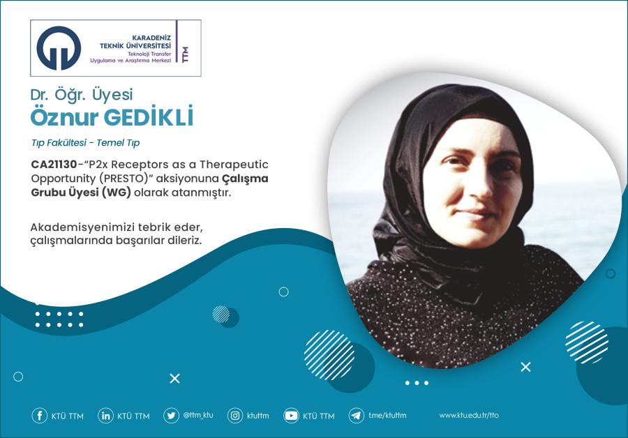 Üniversitemiz Tıp Fakültesi Temel Tıp Bölümü öğretim üyesi Dr. Öğr. Üyesi Öznur GEDİKLİ, COST Programı’nın “CA21130 - P2x Receptors as a Therapeutic Opportunity (PRESTO)” aksiyonuna Çalışma Grubu Üyesi (WG) olarak atanmıştır.