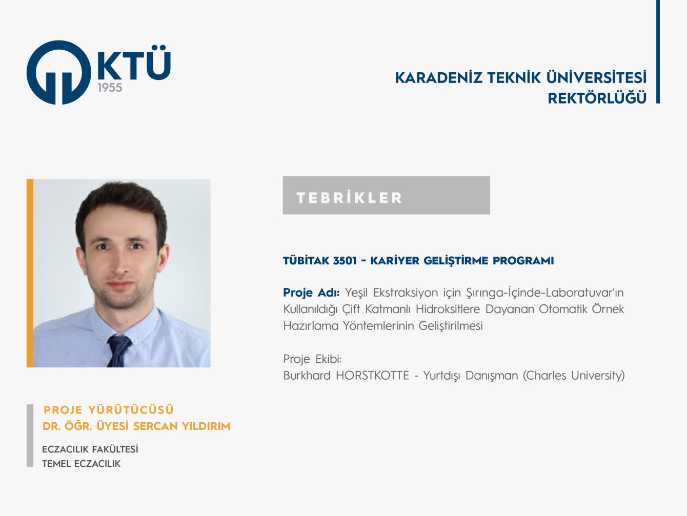 Dr. Öğr. Üyesi Sercan YILDIRIM'a TÜBİTAK 3501 Proje Desteği