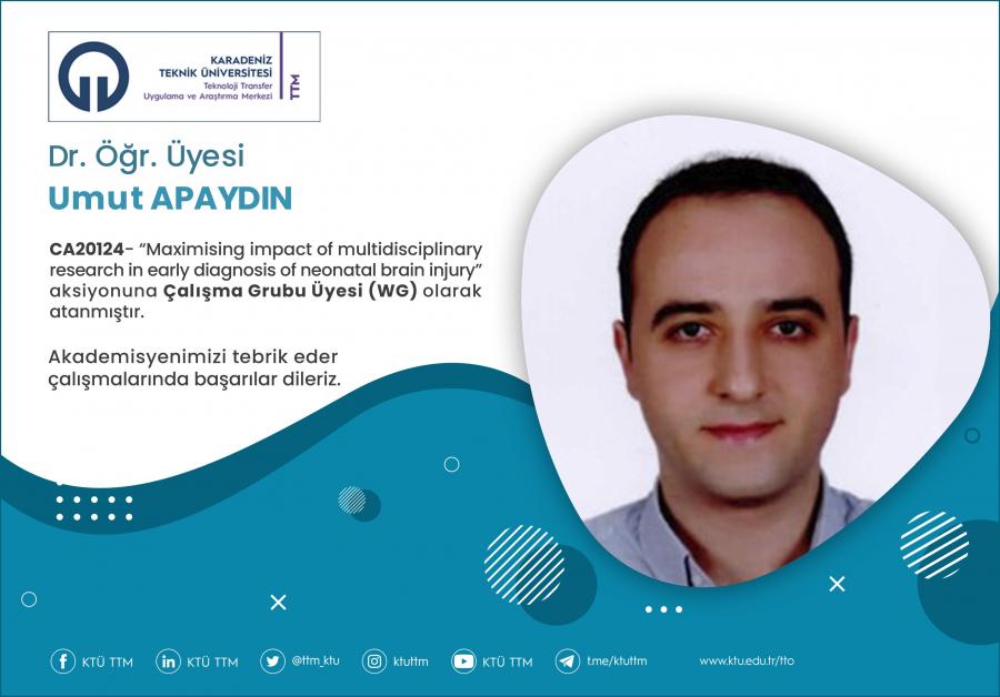 Üniversitemiz Sağlık Bilimleri Fakültesi Fizyoterapi ve Rehabilitasyon öğretim üyesi Dr. Öğr. Üyesi Umut APAYDIN, COST Programı’nın “CA20124 - Maximising impact of multidisciplinary research in early diagnosis of neonatal brain injury” aksiyona Çalışma Grubu Üyesi (WG) olarak atanmıştır.