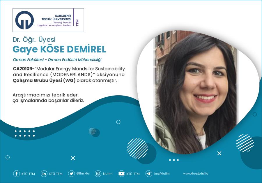 Üniversitemiz Orman Fakültesi Orman Endüstri Mühendisliği Bölümü öğretim üyesi Dr.Öğr.Üyesi Gaye KÖSE DEMİREL, COST Programı’nın “CA20109 - Modular Energy Islands for Sustainability and Resilience (MODENERLANDS)” aksiyonuna Çalışma Grubu Üyesi (WG) olarak atanmıştır.