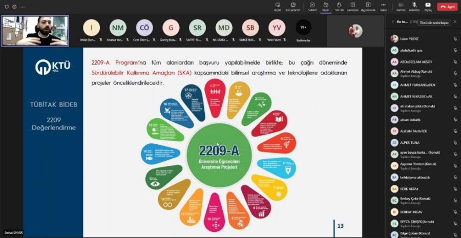 KTÜ Teknoloji Transferi Uygulama ve Araştırma Merkezi (KTÜ TTM) ve KTÜ Elektrik-Elektronik Mühendisliği iş birliğiyle; “TÜBİTAK 2209 A/B Programları Çevrimiçi Bilgilendirme Etkinliği” Proje Uzmanı M. Serhat ÜNVER tarafından gerçekleştirilmiştir. Etkinlikte üniversitelerde öğrenim görmekte olan lisans öğrencilerini, projeler yoluyla araştırma yapmaya teşvik etmek amacıyla oluşturulan TÜBİTAK 2209 A Üniversite Öğrencileri Araştırma Projeleri Desteği ve TÜBİTAK 2209 B Üniversite Öğrencileri Sanayiye Yönelik Araştırma Projeleri Programlarının başvuru koşullarının ve detaylarının yanı sıra, lisans öğrencilerinin faydalanabilecekleri diğer programların da detayları paylaşılmıştır.