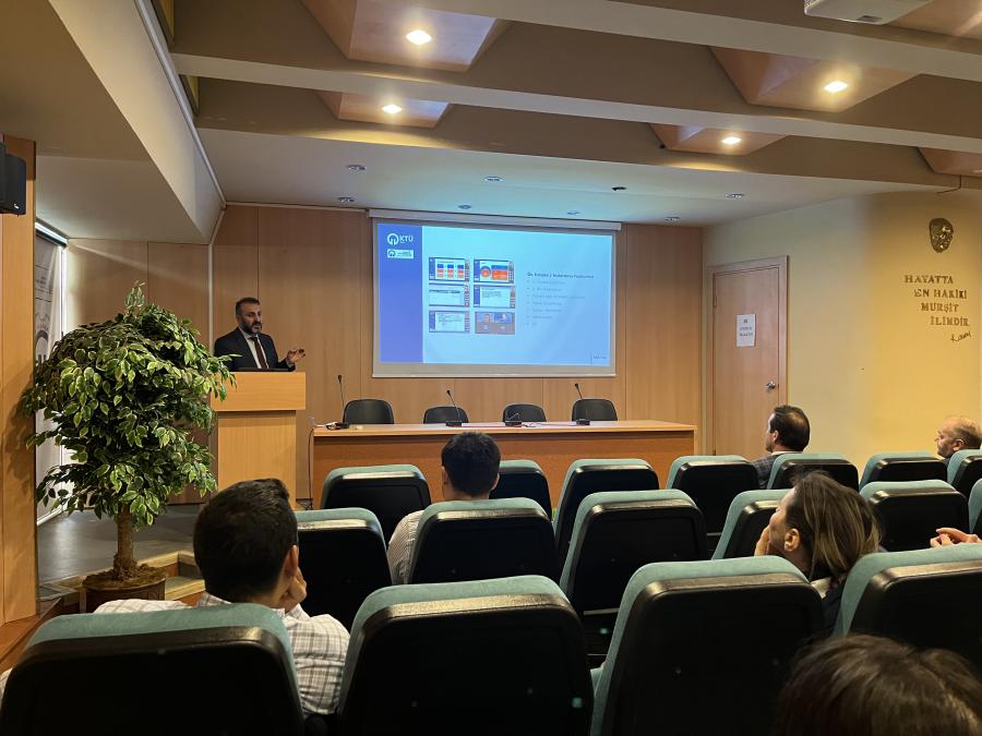 KTÜ TTM Müdürü Prof. Dr. Oktay Yıldız, Merkezimizin 2022 yıllık faaliyetleri hakkında katılımcılara bilgi aktardı. Sunumunda 2022 yılında halihazırda 140’a yakın etkinlik/eğitim düzenlendiğini, personelin 100’e yakın eğitime/etkinliğe katılım sağladığını, Üniversitemiz akademisyenlerinin projelerine/fikirlerine çok çeşitli destekler sağlandığını, bu sayede KTÜ’nün ulusal kaynaklardan desteklenen 30 projesinin kabul edildiğini, bu projelerin bütçesinin yaklaşık 14 Milyon TL olduğunu, uluslararası kaynaklardan desteklenen 7 projesinin kabul edildiğini ve bütçelerinin yaklaşık 23Milyon TL olduğunu belirtti. Öte yandan sunumunda üniversite-sanayi iş birliği çalışmalarını geliştirmek için gerçekleştirilen çalışmalara da değinmiş olup, bu bağlamda akademisyen/firma ziyaretleri, sözleşme bazlı araştırma çalışmaları, eşleştirme çalışmaları gerçekleştirildiğini bu sayede kamu fonları ile 30, özel sektör fonları ile 28 projenin desteklenerek çalışmaları sürdürdüğünü ve bu projelerin toplam bütçesinin 10 milyon TL’nin üzerinde olduğunu belirtti. KTÜ TTM tarafından yönetilen KTÜ Fikri Sınai Mülkiyet Hakları Politikası çerçevesinde 2022 yılı itibariyle 220’den fazla buluş sahibi, 116 ulusal patent başvurusu, 41 uluslararası patent başvurusu yapmış olduğunu, tescilli patentlerin ticarileşmesi için çalışmaların sürdüğünü belirtti. Merkez tarafından öğrenci ve girişimcilere de çok aktif destek verildiğini belirtilmiş olup, uygulanan TÜBİTAK Projesi sayesinde 1,5 yılda 16 girişimcinin şirketleşmesine destek olunduğunu, öğrenci projelerinde de başarı oranının %95’e varan seviyede olduğunu belirtti.