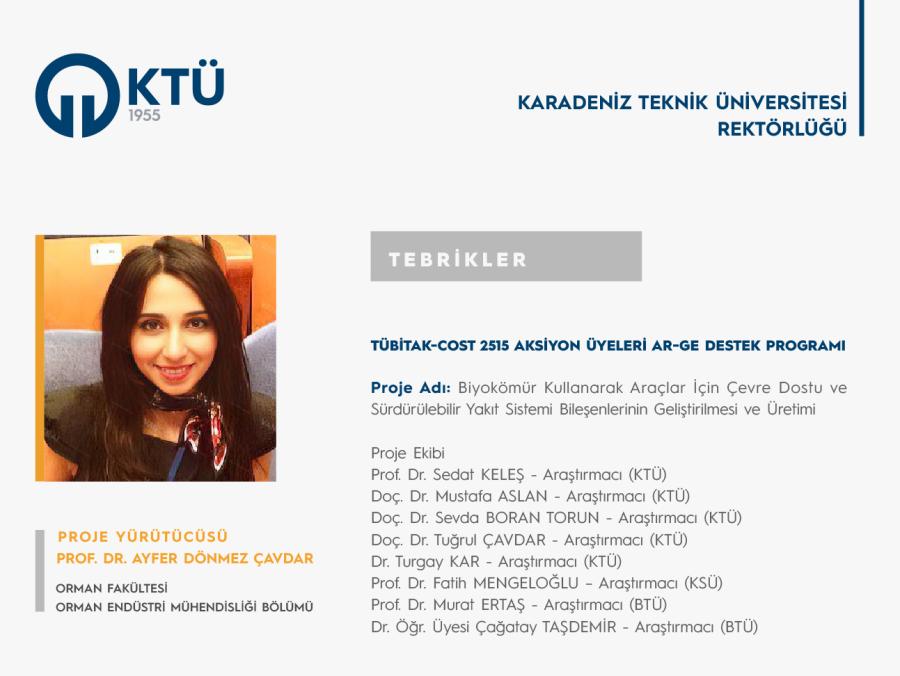 Üniversitemiz Orman Fakültesi Orman Endüstri Mühendisliği Bölümü Öğretim Üyesi Prof. Dr. Ayfer DÖNMEZ ÇAVDAR’ın “Biyokömür Kullanarak Araçlar İçin Çevre Dostu ve Sürdürülebilir Yakıt Sistemi Bileşenlerinin Geliştirilmesi ve Üretimi” başlıklı projesi, TÜBİTAK-COST 2515 Aksiyon Üyeleri Ar-Ge Destek Programı kapsamında desteklenmiştir.