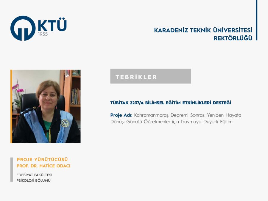 Üniversitemiz Edebiyat Fakültesi Psikoloji Bölümü öğretim üyesi Prof. Dr. Hatice ODACI’nın "Kahramanmaraş Depremi Sonrası Yeniden Hayata Dönüş: Gönüllü Öğretmenler için Travmaya Duyarlı Eğitim" başlıklı projesi, “TÜBİTAK 2237/A Programı” kapsamında desteklenmiştir.