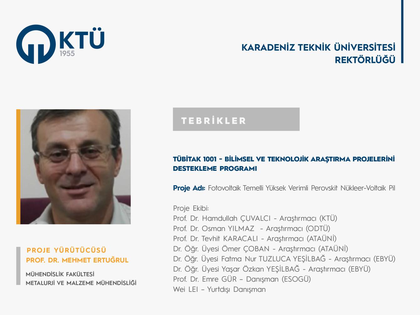 Üniversitemiz Mühendislik Fakültesi Metalurji ve Malzeme Mühendisliği Bölümü öğretim üyesi Prof. Dr. Mehmet ERTUĞRUL’un "Fotovoltaik Temelli Yüksek Verimli Perovskit Nükleer-Voltaik Pil" başlıklı projesi “TÜBİTAK 1001 - Bilimsel ve Teknolojik Araştırma Projelerini Destekleme Programı” kapsamında desteklenmiştir.