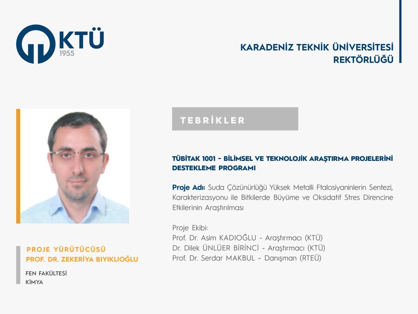 Üniversitemiz Fen Fakültesi Kimya Bölümü öğretim üyesi Prof. Dr. Zekeriya BIYIKLIOĞLU’nun "Suda Çözünürlüğü Yüksek Metalli Ftalosiyaninlerin Sentezi, Karakterizasyonu ile Bitkilerde Büyüme ve Oksidatif Stres Direncine Etkilerinin Araştırılması" başlıklı projesi “TÜBİTAK 1001 - Bilimsel ve Teknolojik Araştırma Projelerini Destekleme Programı” kapsamında desteklenmiştir.