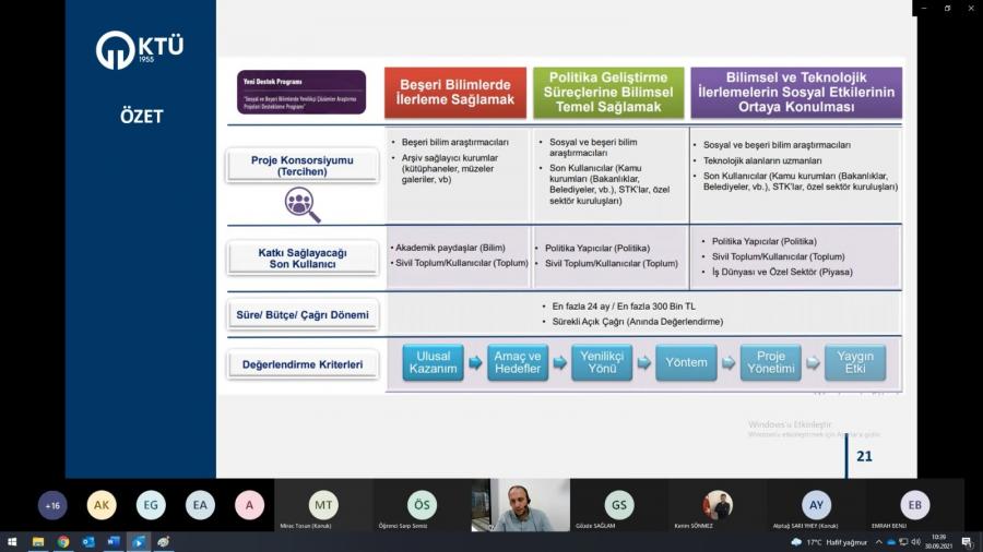 KTÜ TTM organizasyonuyla; TÜBİTAK ARDEB 3005-Sosyal ve Beşeri Bilimlerde Yenilikçi Çözümler Araştırma Projeleri Destek Programını tanıtmak, araştırmacılarımızın sorularını yanıtlamak ve ihtiyaç duydukları destek türlerine dair görüş alışverişinde bulunmak amacıyla 29 Eylül 2021 Çarşamba Günü Saat: 14.00’da Üniversitemiz araştırmacılarına yönelik bilgilendirme sunumu gerçekleşti.