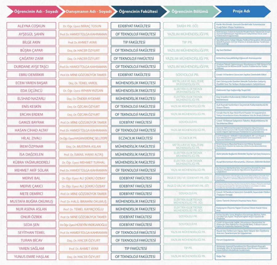 TÜBİTAK 2209-A Üniversite Öğrencileri Araştırma Projeleri Destekleme Programı kapsamında Karadeniz Teknik Üniversitesi’nde öğrenim gören 45 adet lisans öğrencisi proje başvurusunda bulunmuştur. Üniversitemizin Tarih, Yazılım Mühendisliği, Tıp, Sosyoloji, Metalurji ve Malzeme Mühendisliği, Elektrik-Elektronik Mühendisliği, İngiliz Dili ve Edebiyatı ve Eczacılık bölümlerinde öğrenim gören 30 lisans öğrencimiz bu program kapsamında desteklenmeye hak kazanmıştır. Projeleri desteklenmeye hak kazanan öğrencilerimizi ve danışmanlarını tebrik eder başarılarının devamını dileriz.