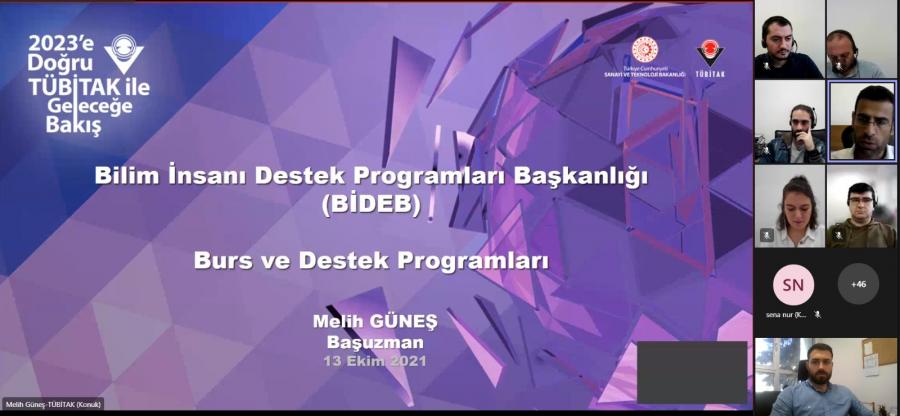 Üniversitemiz lisans ve lisansüstü öğrencileri ile doktora sonrası araştırmacılara yönelik TÜBİTAK Bilim İnsanı Destekleme Daire Başkanlığı (BİDEB) Burs programları hakkında çevrimiçi bilgilendirme etkinliği düzenlendi. Etkinlik, TÜBİTAK BİDEB Uzmanı Melih GÜNEŞ’in burs programları sunumunun ardından soru cevap ile tamamlandı.