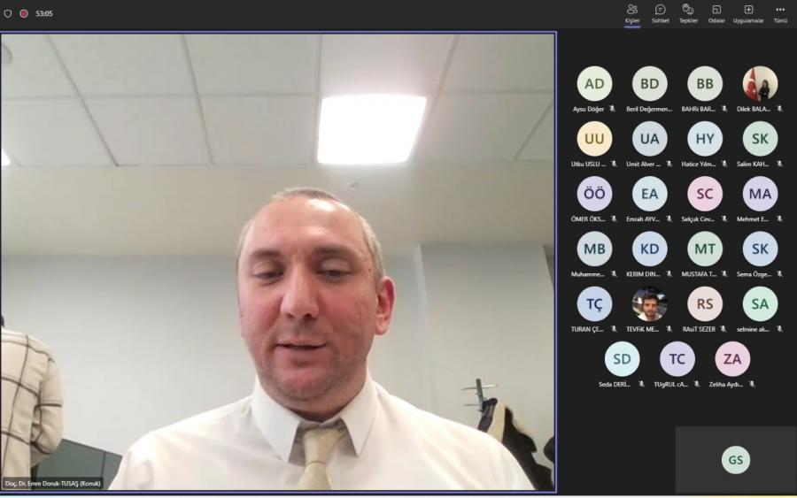 KTÜ Teknoloji Transferi Uygulama ve Araştırma Merkezi ve Türk Havacılık ve Uzay Sanayii A.Ş (TUSAŞ) organizasyonuyla üniversitemiz yüksek lisans/doktora öğrencileri ve akademisyenlerine hitaben; TUSAŞ Üniversite İş Birliği Yönetim Şefi Doç. Dr. Emre DORUK’un konuşmacı olarak yer aldığı bilgi günü etkinliği, Rektör Yardımcımız Prof. Dr. Halil İbrahim OKUMUŞ’un katılımıyla online olarak gerçekleştirildi.