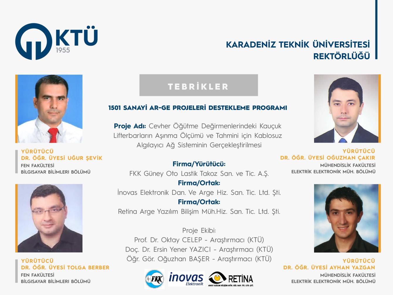 Üniversitemiz Fen Fakültesi Bilgisayar Bilimleri Bölümü akademisyenlerinden Dr. Öğr. Üyesi Uğur ŞEVİK ve Dr. Öğr. Üyesi Tolga BERBER’in kurucu ortağı olduğu Trabzon Teknokent bünyesinde yer alan Retina Arge Yazılım Bilişim Müh. Hiz. San. Tic. Ltd. Şti. ile Mühendislik Fakültesi Elektrik Elektronik Mühendisliği Bölümü akademisyenlerinden Dr. Öğr. Üyesi Oğuzhan ÇAKIR ve Dr. Öğr. Üyesi Ayhan YAZGAN’ın kurucu ortağı olduğu Trabzon Teknokent bünyesinde yer alan İnovas Elektronik Dan. Ve Arge Hiz. San. Tic. Ltd. Şti.’nin FKK Güney Oto Lastik Takoz San. ve Tic. A.Ş. firması ortaklığında TÜBİTAK 1501 Sanayi Ar-Ge Projeleri Destekleme Programı 2023 yılı 1. Çağrısı kapsamında yaptıkları başvuru desteklenmeye hak kazanmıştır.